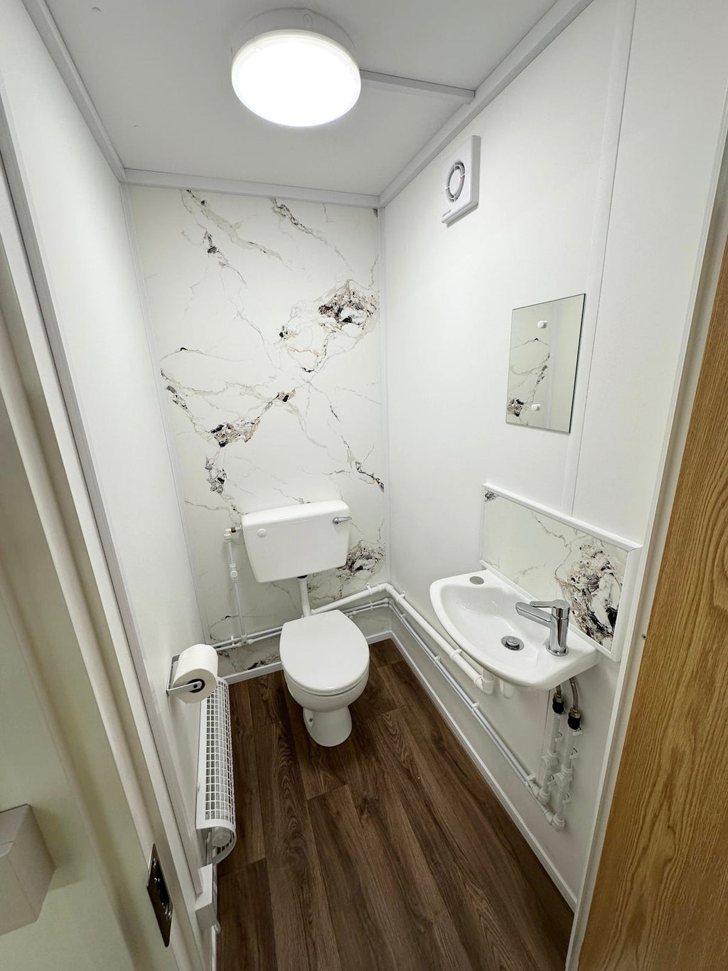 New Fully installed WC/Wash Room including, WC, wash basin, water heater, loo roll holder, extractor fan, internal LED light with seperate internal switch, single wall tube heater & marble effect splash back.